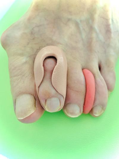 En fonction des problèmes posés, et après avoir effectué les soins qui s’imposent, le podologue peut être amené à isoler la zone de frottement afin de soulager les kératomes (cors, durillons, oeils-de-pedrix, etc...). Il réalise pour ce faire une “ orthoplastie ”, confectionnant une orthèse amovible que le patient doit porter dans la journée. C’est une orthèse souple ou semi-rigide de repositionnement d’orteils ou de protection, modelée sur le pied et façonnée en élastomère de silicone.